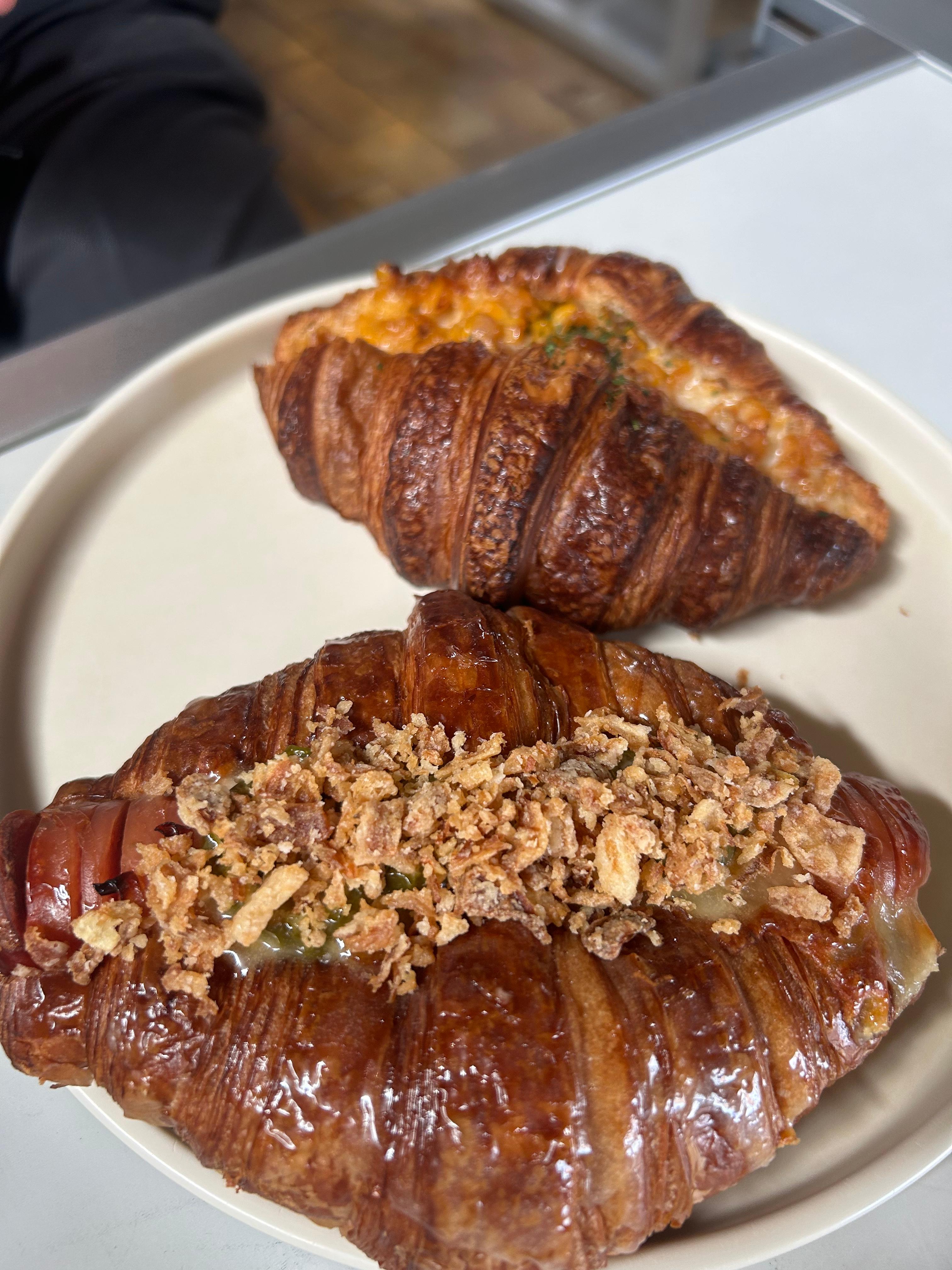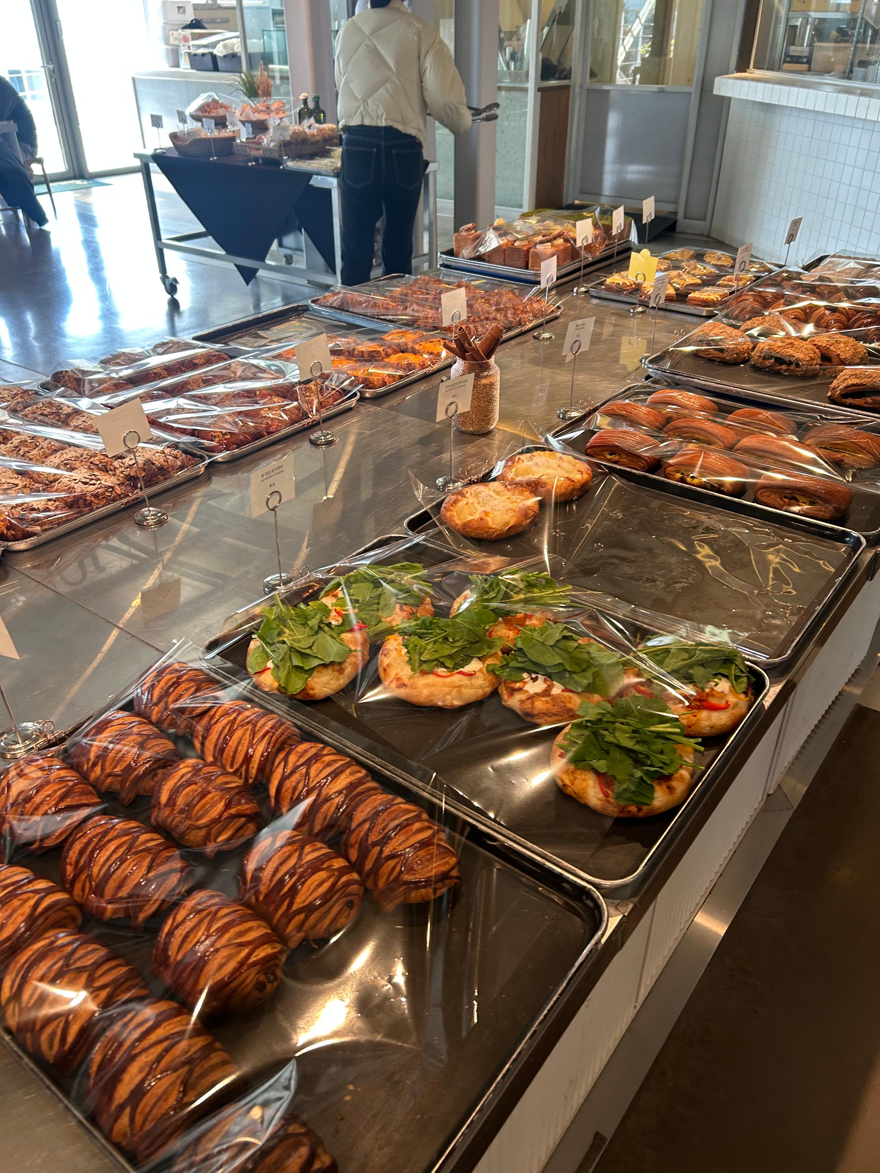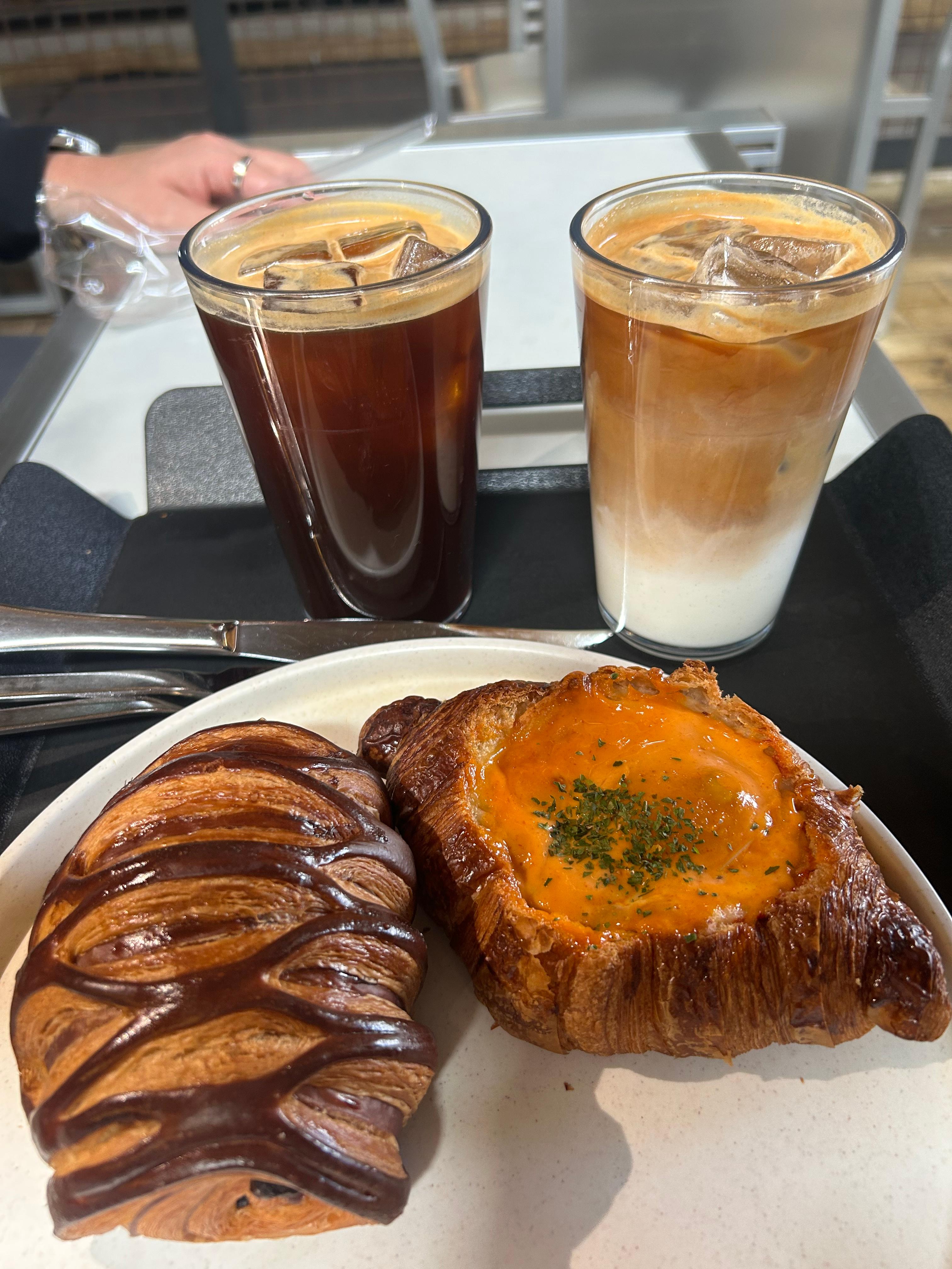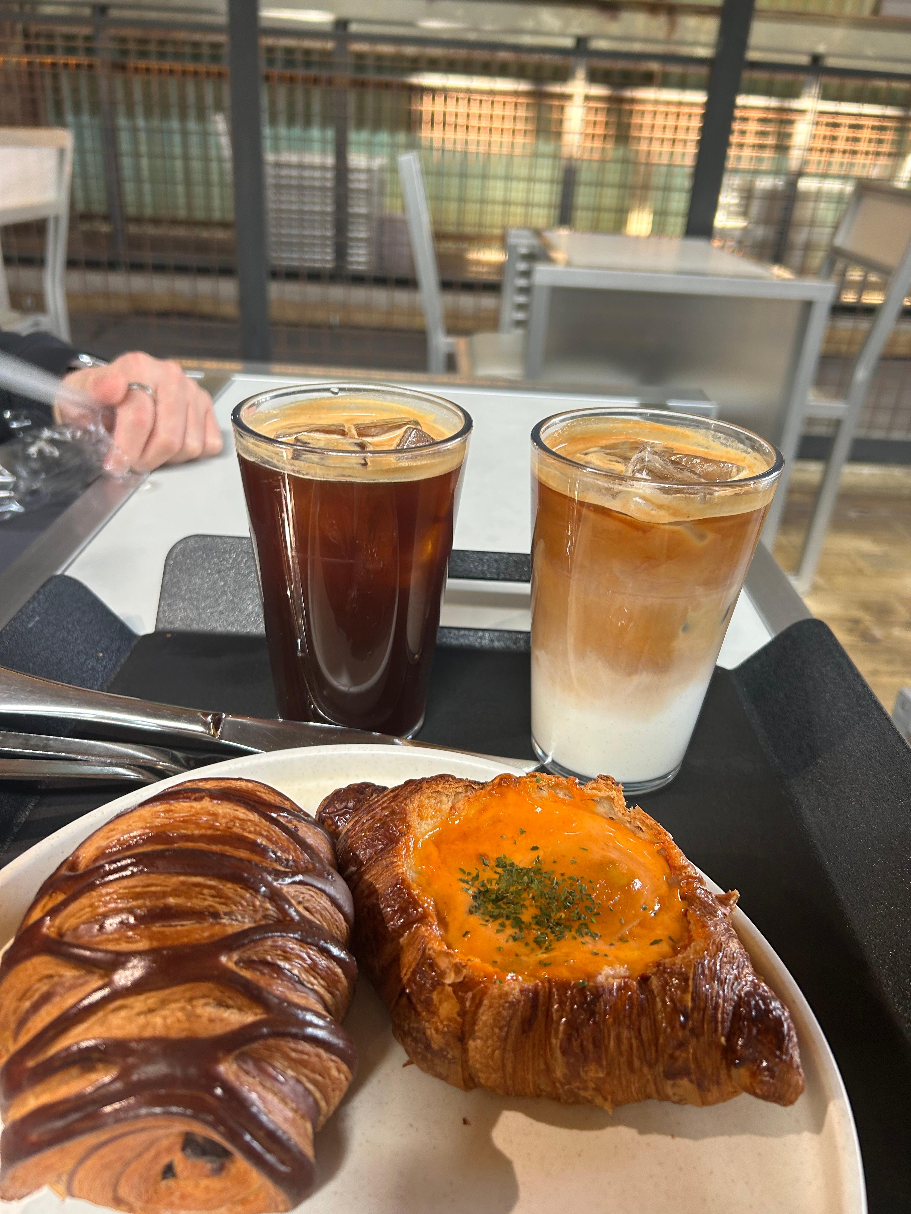 베이커리 종류가 엄청 다양하죠? 크로아상, 소금빵, 치아바타, 쇼콜라, 스콘, 식빵 등 종류가 정말 다양하고 먹음직스러워 보였어요. 저희는 배가 고파서 쇼콜라와 랜치 샌드위치, 에그인헬 크루아상을 주문했어요.