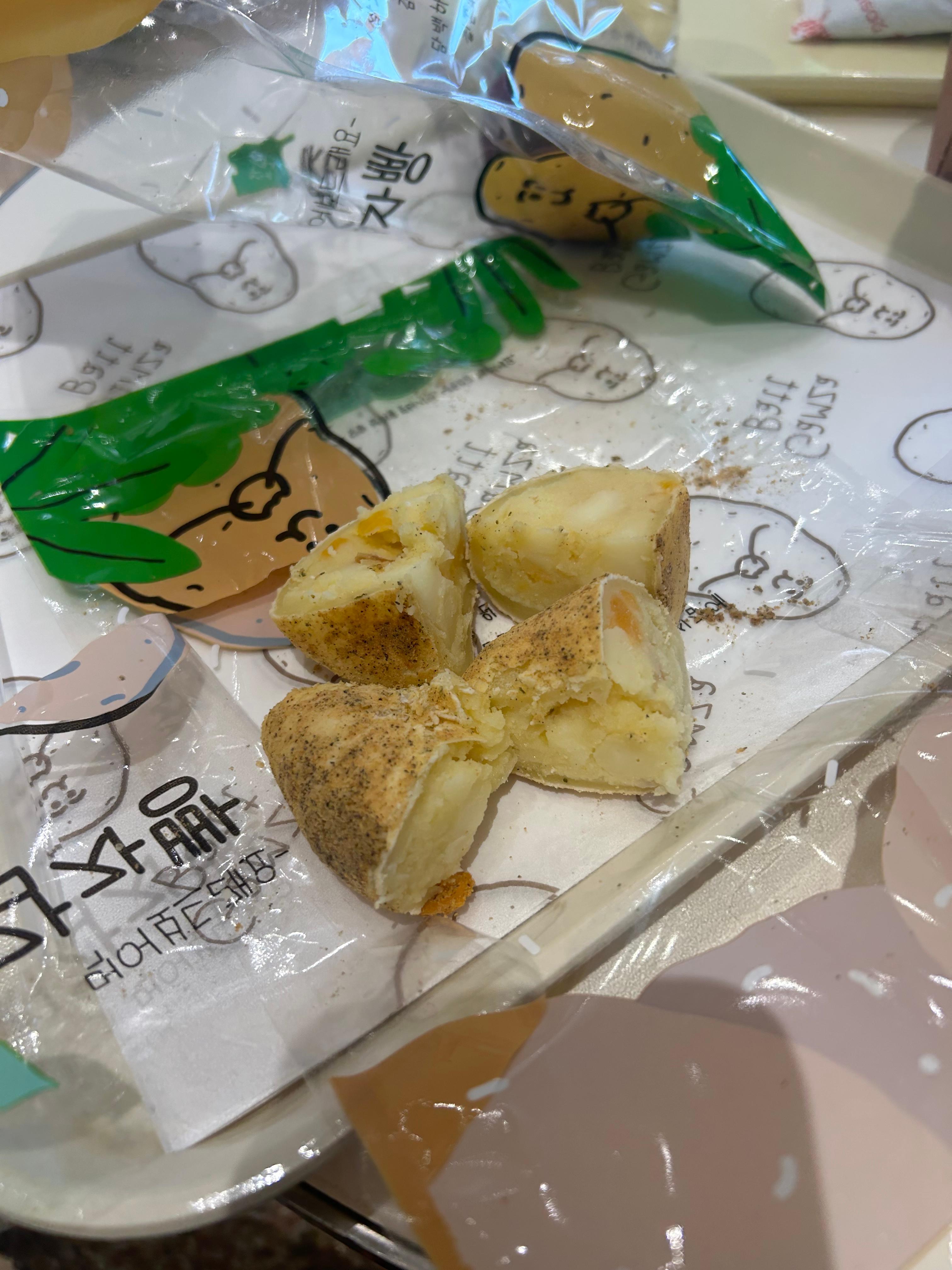 빵은 주문 시 바로 픽업이 가능했고 음료만 아래에서 받으면 되었는데요! 감자빵은 겉은 가루가 묻어있고 쫀득한 피였어요. 개인적으로는 다른 프랜차이즈 피가 더욱 쫄깃한 느낌이었답니다! 안쪽에는 포슬포슬한 감자가 들어있고 달달함이 추가되어 있었어요.