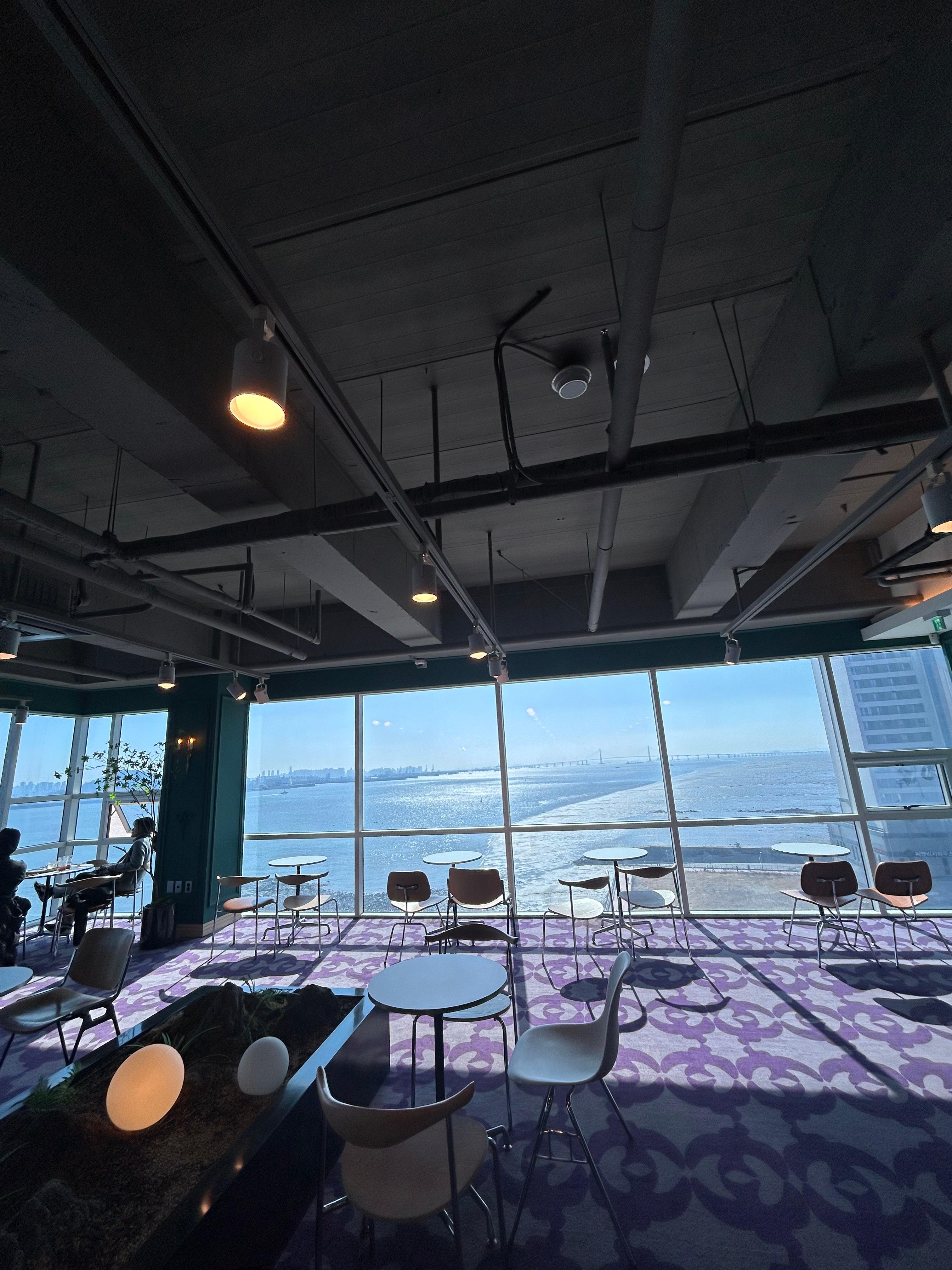 카페는 9층에 자리해 있었는데 들어서니 통창으로 오션뷰가 펼쳐졌어요! 보라색 느낌의 엔틱한 무드와 푸른 바다의 색이 낯설면서 색다르게 느껴지는 공간이었답니다.