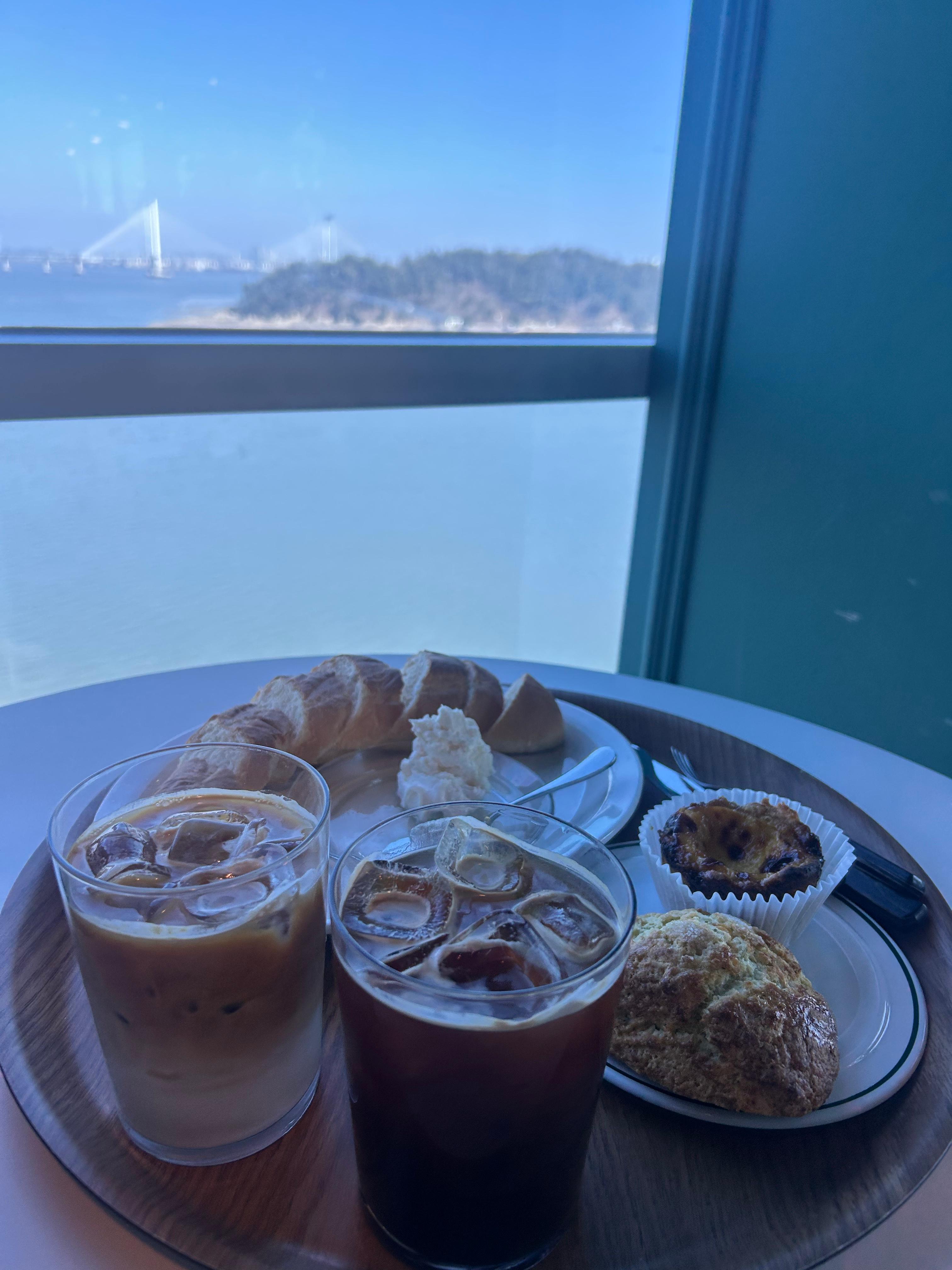 저희도 창가 주변에 자리를 잡고 앉았어요. 얼마 지나지 않아 주문한 커피가 나왔어요. 커피 원두는 산미 있는 원두와 고소한 원두를 선택할 수 있었는데요! 라테는 산미 있는 원두로 했더니 부드러우면서 잘 어울리더라고요.